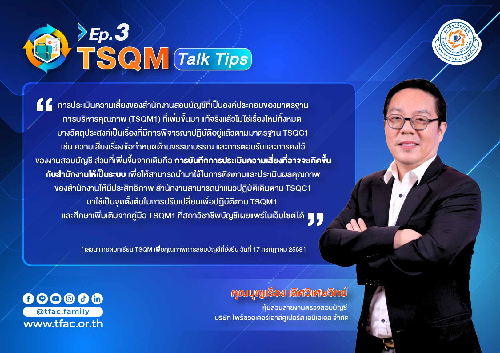 สามารถรับชมงานเสวนา "ถอดบทเรียน TSQM เพื่อคุณภาพการสอบบัญชีที่ยั่งยืน" เมื่อวันที่ 17 กรกฎาคม 2568 ย้อนหลังได้ทาง Youtube >> https://www.youtube.com/watch?v=00z49inEkY4&t=151s