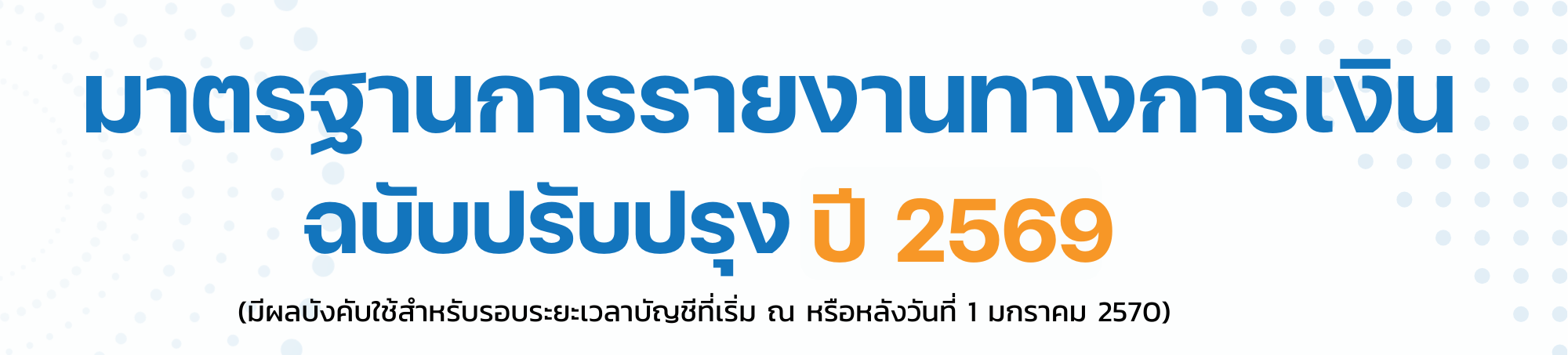 | การเปลี่ยนแปลงในมาตรฐานการรายงานทางการเงิน ฉบับปรับปรุง 2569 มีวัตถุประสงค์เพื่อปรับปรุงมาตรฐานให้เกิดความชัดเจน ความสอดคล้อง และการนำมาตรฐานไปใช้ในทางปฏิบัติให้มีประสิทธิผลยิ่งขึ้น โดยสรุปเรื่องและประเด็นที่ปรับปรุงแก้ไข ดังนี้ |